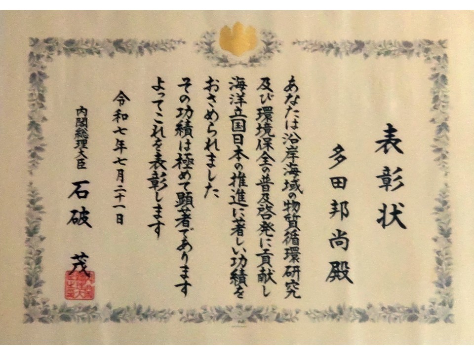 多田名誉教授は、香川大学農学部の教員として、長年「瀬戸内海の沿岸域における物質循環に関する研究」を通して、瀬戸内海の環境保全と豊かな海作りに貢献されてきました。また、精力的に様々な「沿岸海洋の理解・環境保全の普及啓発と啓蒙活動」に取り組まれ、数多くの『海好き人』を育てられました。今回はその長年の成果が「海洋立国日本の推進に関する特別な功績」分野で認められ、今回の受賞に至りました。表彰式当日は、東京国際クルーズターミナルにて坂井内閣府特命担当大臣より表彰状(写真)が授与されました。
