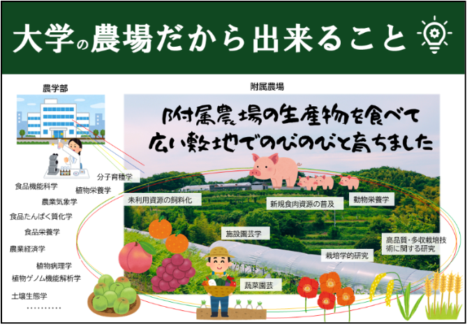 香川大学農学部附属農場には、作物栽培、蔬菜花卉、果樹、そして畜産の4部門があります。これほどの幅広い分野を有し、機能している農場は少なく、全国の国立大学の中でもトップレベルのものです。