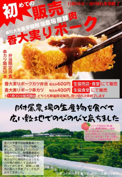 11月3日(月・祝)に農学部キャンパスにおいて開催予定の「オープンキャンパス・収穫祭2025」では、香川大学生協の売店、食堂にて、「香大実りポークカツ弁当」(数量限定30食)、および「香大実りポーク串カツ」(数量限定50本)を販売予定です。