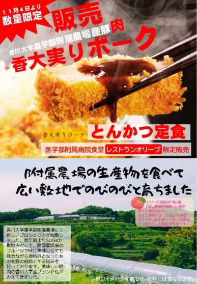 11月4日(火)からは、医学部附属病院食堂「レストランオリーブ」において、香大実りポークを使用した「とんかつ定食」(数量限定)を販売予定です。