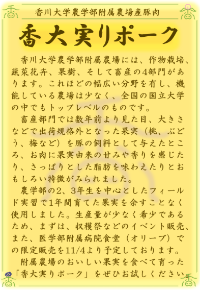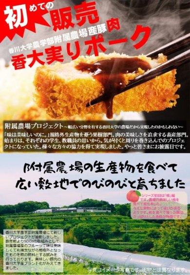 この機会に、附属農場のおいしい果実を食べて育った「香大実りポーク」をぜひご賞味ください。
