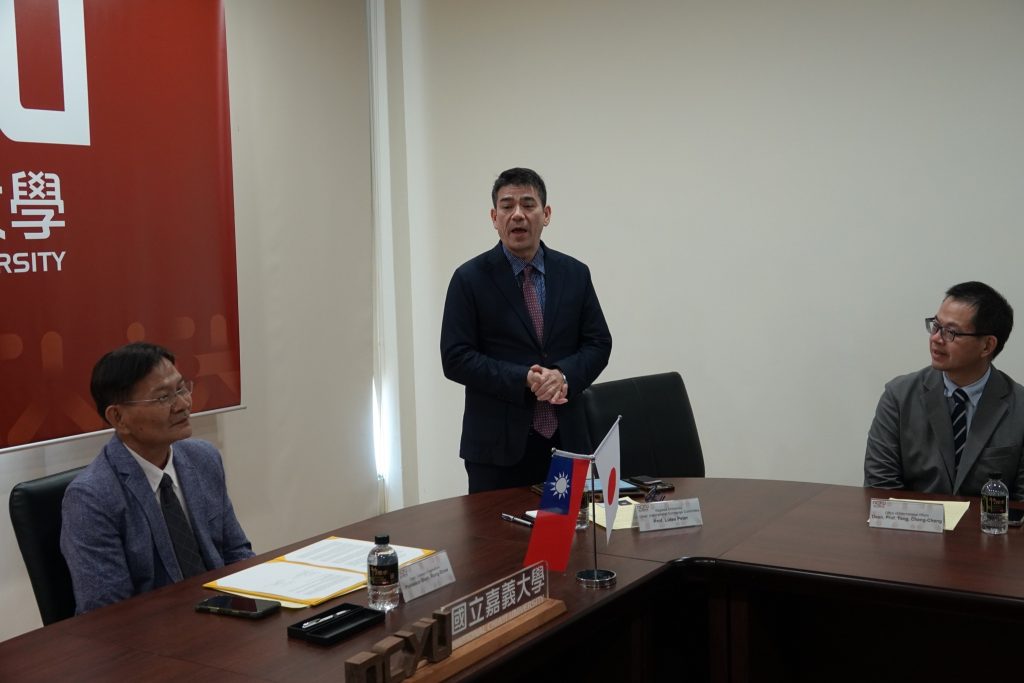 式典では、香川大学農学部小川雅廣学部長と嘉義大学農学院SHEN Rong-Show学部長から、これまでの両学部の交流の歴史への謝辞や、ダブルディグリープログラムの実施による交流活発化への期待が述べられました。その後、両学部長が協定書に署名を行いました。最後に、嘉義大学へ訪問し現地から式典に参加した香川大学農学部のLUTES Peter国際交流委員長、嘉義大学農学院のCHIANG Yen-Cheng副学部長から、本協定締結への祝辞が述べられ、同じく嘉義大学を訪問した農学部3年生の2名の学生とともに記念品を交換しました。