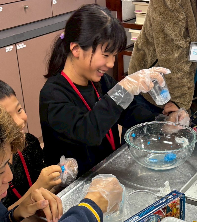 香川大学農学部学生ボランティアサークルASUS(エーサス)は、2025年12月21日(日)に香川大学三木サテライトオフィス(サンサン館みき)にて、小学生対象の科学実験講座「冬の科学体験教室」を開催しました。教室では、「カラフルな水の層を作ろう」、「部屋の中で“雪”を作ろう」、そして「スライムからスーパーボールを作ろう」の3つの実験を行いました。参加して頂いた皆さんからは、「色水にしおをかけると重くなるのがふしぎでおもしろかった」、「ゆきみたいにできておもしろいとおもった」、「上手につくれたり、いろんな物をつかって楽しかった」など、たくさんの感想を頂きました。