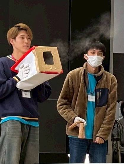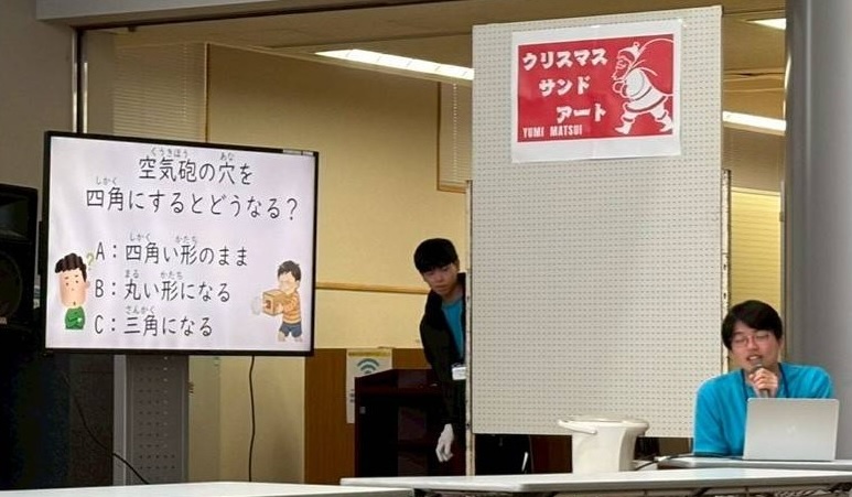 また、サンサン館みきのエントランスホールでは、「空気砲」を用いた科学実験ショーを行いました。空気砲の原理や発射口の形を変え、発射される煙の形はどうなるかなど、クイズを交えつつ参加者自身に空気の力を体感してもらいました。 会場は多くの来場者で賑わい、体験コーナーに行列ができるほどの盛況ぶりでした。