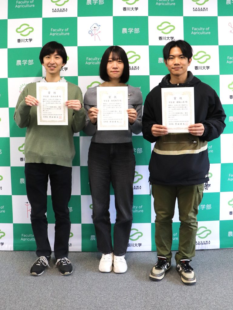 農学研究科の酵素学研究室(松沢研究室)に所属する修士課程2年生の島田尚季さん、同じく修士課程1年生の藤輪心真さんと西尾樹乃さんの3名が日本生物工学会西日本支部 学生賞を受賞しました。3名は黄麹菌Aspergillus oryzaeが生産する酵素の多様性に関する研究に日々は励んでいます。