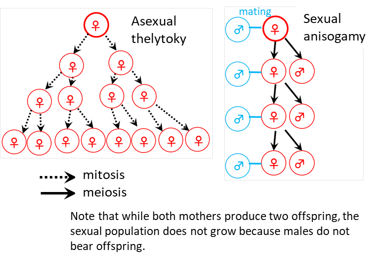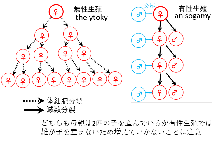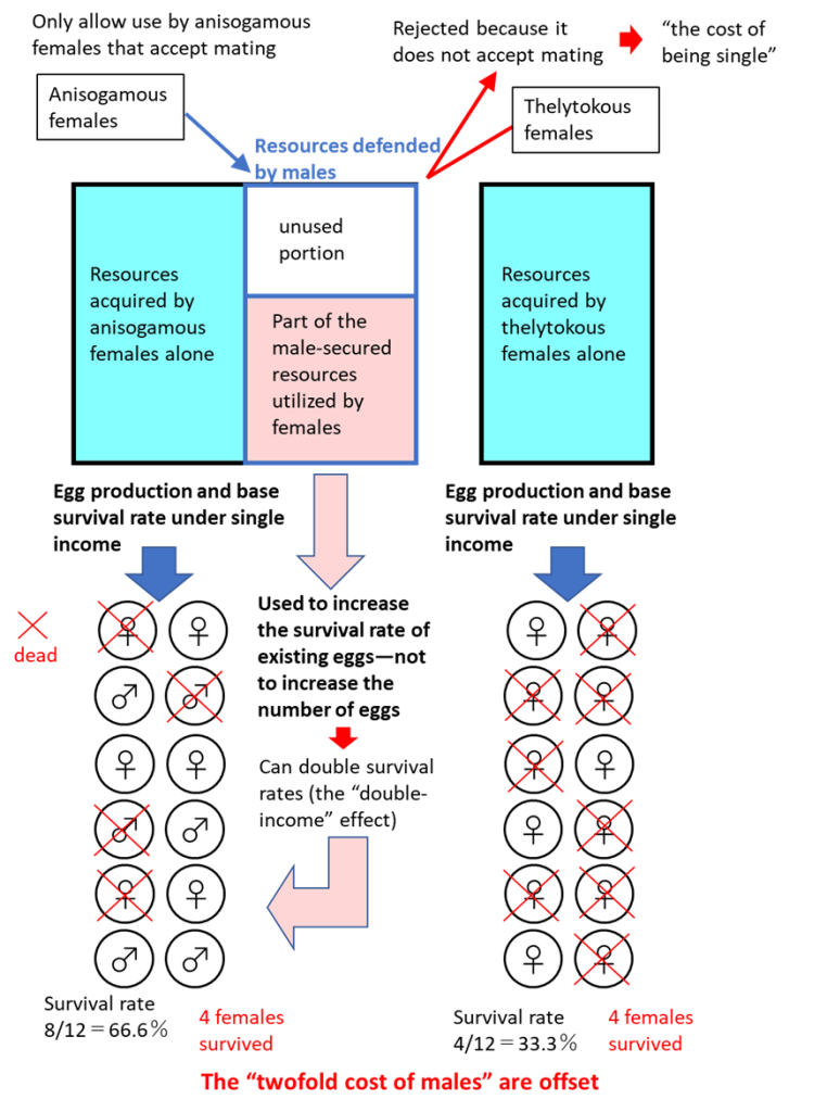 An important point in discussing the “twofold cost of sex” is that, because the difference in population growth rates between thelytoky and anisogamy is twofold per generation, the difference in population size accumulates to 1,024 times after 10 generations. This means that for anisogamy to compete with thelytoky, males must provide twofold benefit per generation for it to be worth the cost. Consequently, the benefits expected from males cannot possibly be met by “genetic benefits” that return only in later generations. For example, the “Red Queen” hypothesis—which is currently the standard theory regarding the benefits of sexual reproduction— , the “Red Queen” hypothesis assumes that males carry different genes from females and that mating produces new adaptive genotypes (such as pathogen resistance). However, because sex itself does not generate new mutations but merely randomly recombines existing ones, it is impossible to continue producing genotypes capable of successfully adapting to the environment when it changes moment by moment and the dominant pathogen types shift from generation to generation. To protect an anisogamous population from the invasion of thelytokous mutants, the latter must be eliminated each time they arise. Without the “twofold benefit” derived from males, anisogamy cannot prevail over thelytoky; if the competition carries over to the next generation, the thelytoky population will double, making victory even more difficult. Therefore, what the male must provide is a material benefit that immediately achieves a twofold increase in fitness (number of surviving daughters) in that generation (for the mated female herself), equalling that of thelytoky.