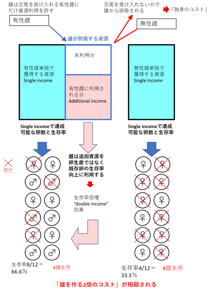 しかし多くの動物において雄はもっぱら交尾回数を増やすことに精力を注ぎ、雌に餌を与えたり、子の世話をする種は限定的です(鳥や人間はむしろ例外)。しかし雄が繁殖戦略の一環として雌や子供にとって重要な資源を守ることresource defenceは広範に見られます。従来、「雄の2倍のコスト」問題とは無関係であるとみられてきた「雄による資源防衛」を安井教授は理論的に結びつけました。雄は豊富な食料源や安全な繁殖地を確保し、交尾を受け入れる有性雌にのみこれらの資源へのアクセスを許します。一方、無性雌は交尾を受け入れないので雄に排除され資源を得ることはできません。その結果、無性雌は自己獲得資源のみに基づく「シングルインカム」状態(これを安井教授は「独身の2倍のコスト」と呼んだ)に対して、有性雌は自己資源に雄提供資源を加えた「ダブルインカム」状態になります。雄確保資源が100%無駄なく雌に利用されることはないにしても、もし雌が追加資源を追加の卵生産ではなく、既存の卵の生存率向上に使うのなら、適応度(生き残る娘の数)をセリトキーと対等以上にすることが可能です。数理モデルとシミュレーションはこのメカニズムが「性の2倍のコスト」を実際に克服できることを示しています。