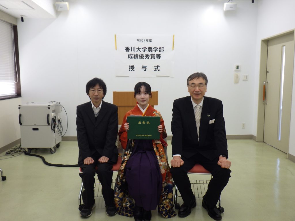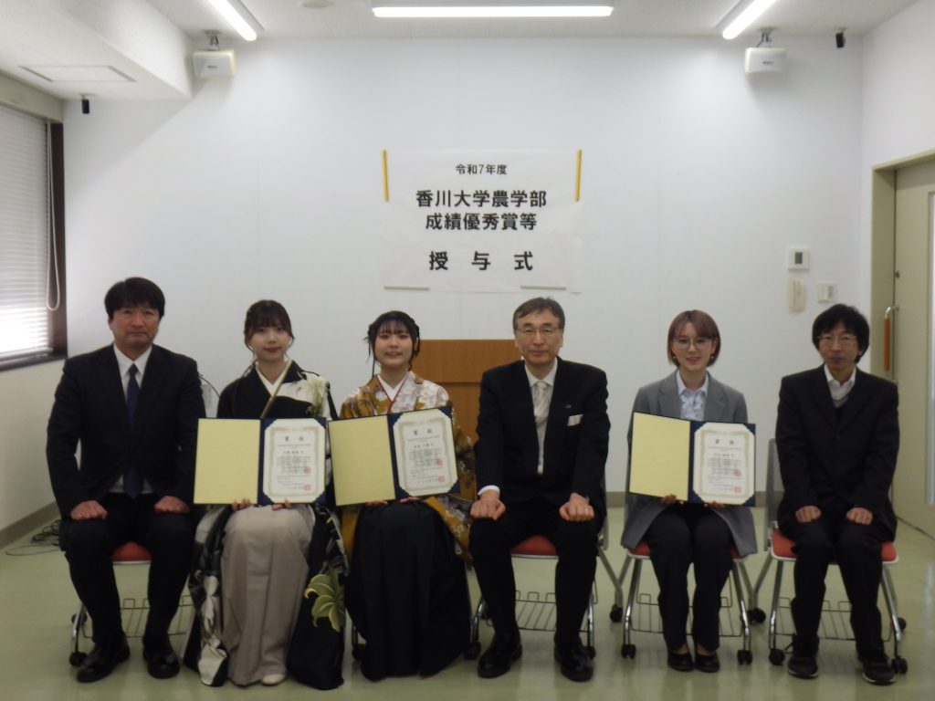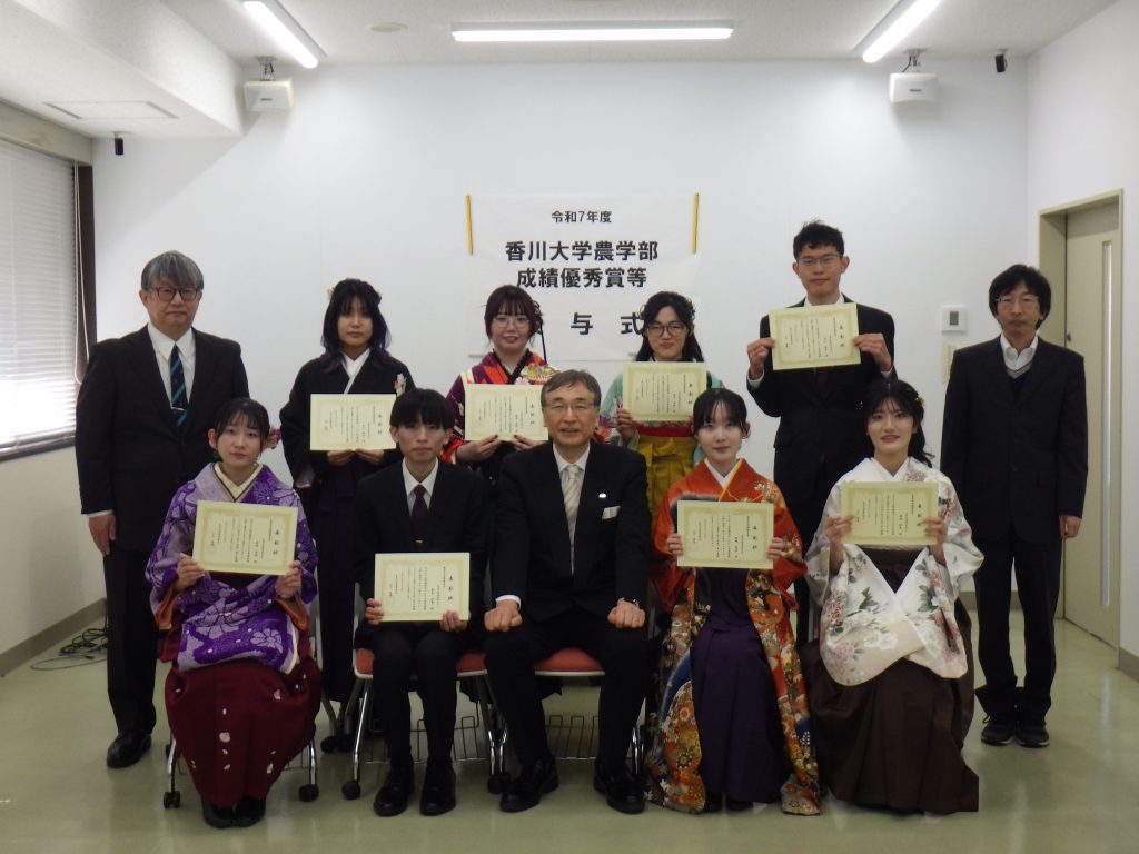 3月24日(火)に、「令和7年度農学部成績優秀賞等授与式」が行われました。農学部成績優秀賞は今年度農学部卒業生の成績優秀者数名に贈られ、学会賞では、日本化学会中四国支部長賞、日本農芸化学会中四国支部奨励賞を授与された学生に賞状が手渡されました。農学部成績優秀賞9名、学会賞4名が表彰されました。授与後、小川農学部長より、受賞のお祝いと今後も香川大学で身に付けた課題解決能力を活かして活躍してほしいというお話をいただきました。今年度も授与式を実施出来たことは、学生にとって良い刺激になったと思います。