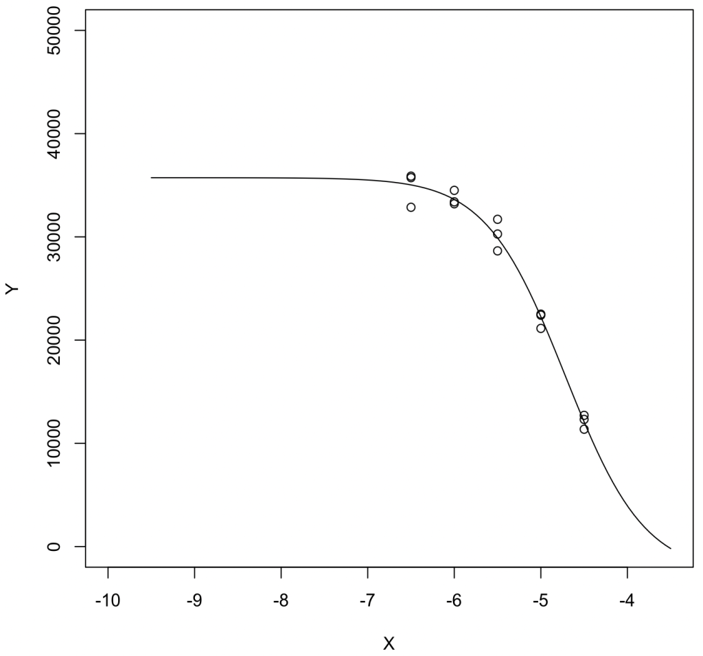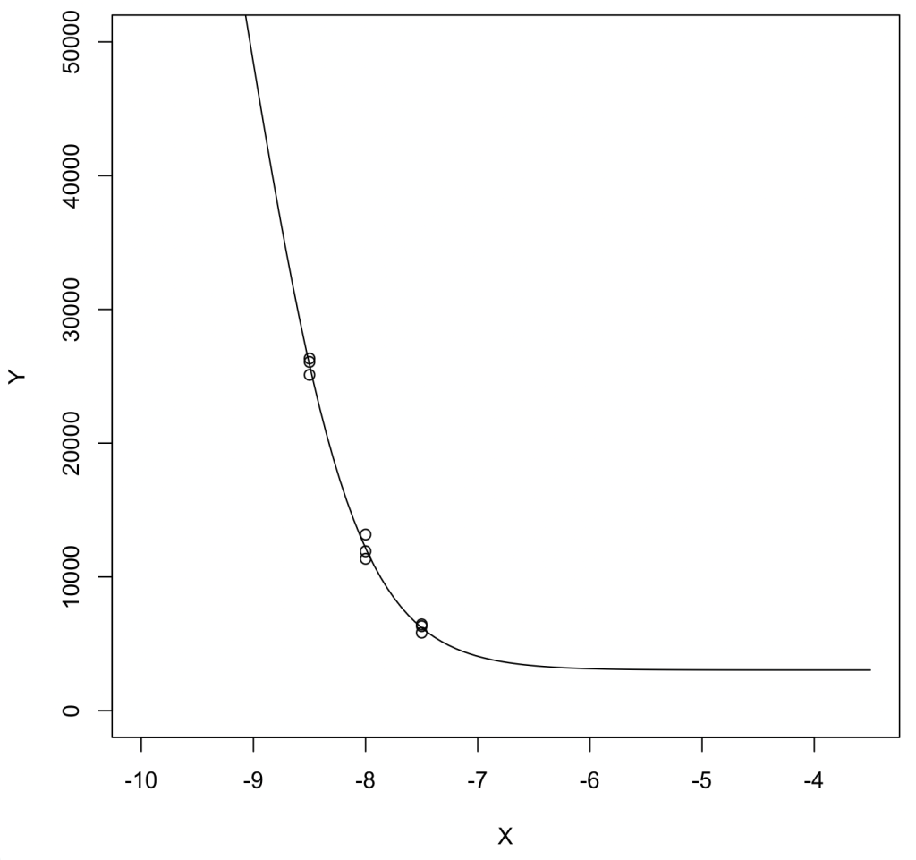 logIT <- c(-8.5,-8.5,-8.5,-8,-8,-8,-7.5,-7.5,-7.5) theta <- c(0.6438,0.6365,0.6090,0.2698,0.2182,0.2342,0.0750,0.0787,0.0612) result <- nls(theta~1/(1+exp(a*log(10)*(logIT - logIC50))),start = c(logIC50=-8.5, a=1)) summary(result)