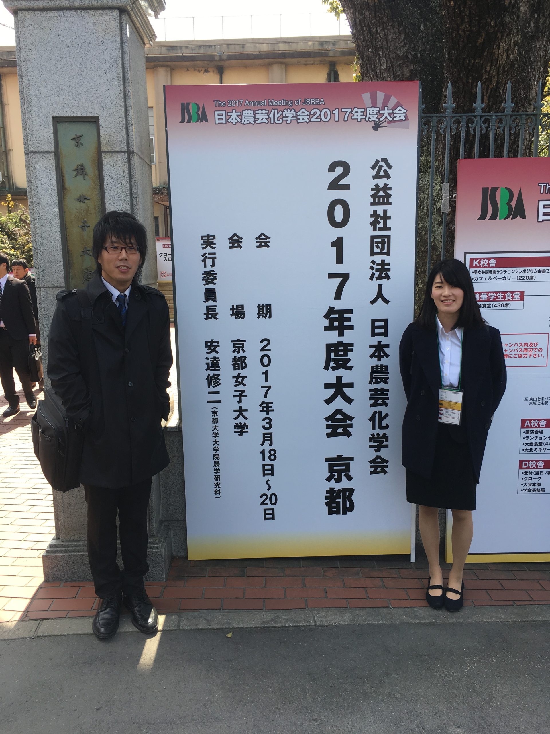 日本農芸化学会2017年度大会,京都 投稿日: 2017年3月21日2025年12月11日 投稿者: RCY 3/17-20に京都で開催された日本農芸化学会2017年度大会で,当研究室の石山君 (M2) と竹本さん (M1) が口頭発表を行いました.天気もよく学会日和でした.