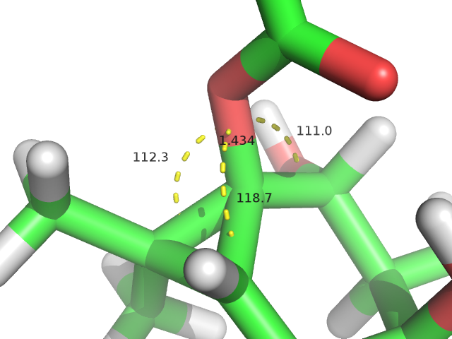em.groをpymolで開いてみると,13位周辺が歪んだ構造になってしまっている.PRB_GMX.topをテキストエディタで開いて,13位酸素原子 (今回はOA1) に関するパラメータを見てみると,