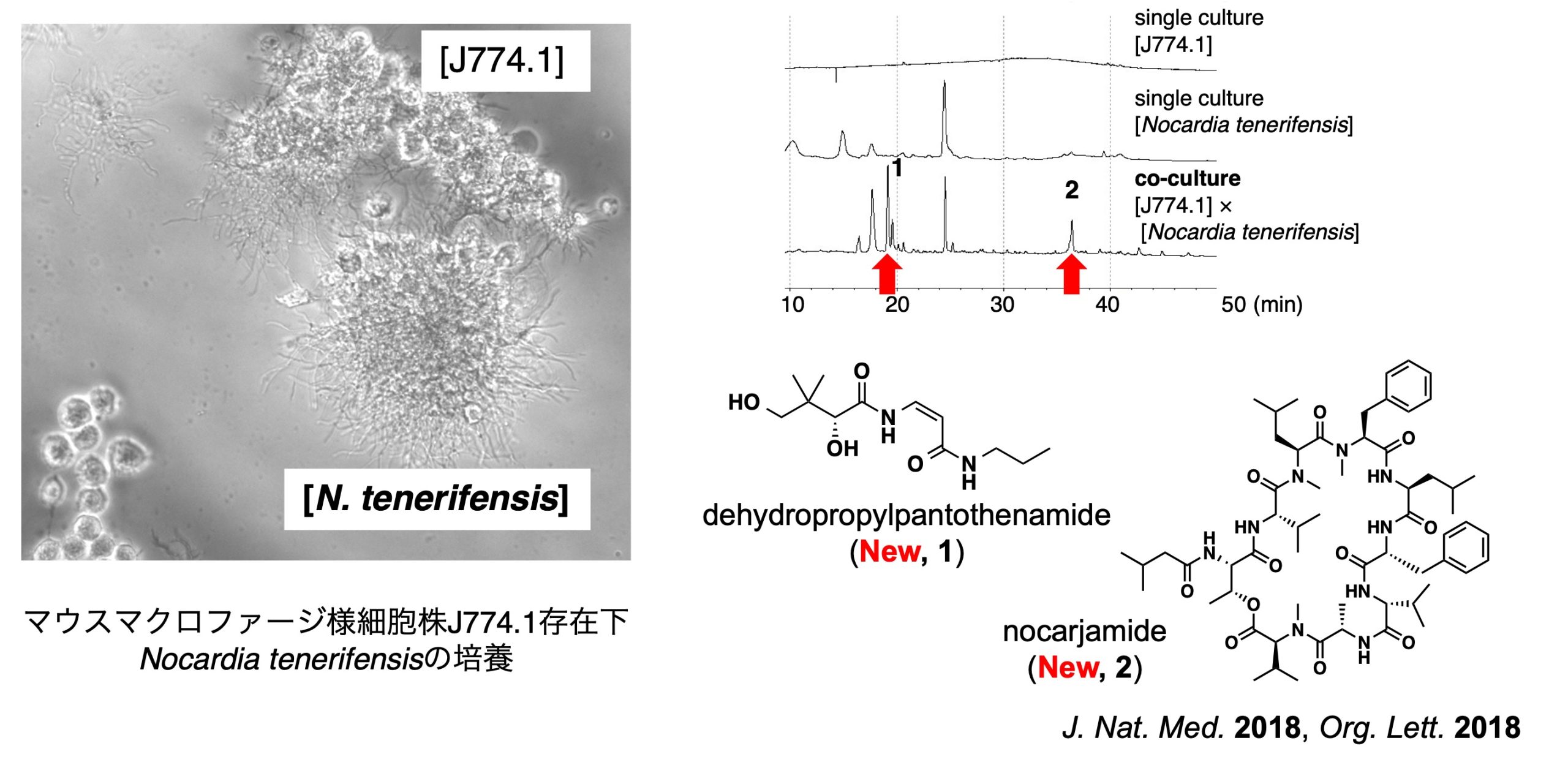 近年,私たちは,微生物の生育環境や生物間相互作用,特に微生物を中心とした関係性に着目した培養法の検討を進め,休眠遺伝子の活性化を試みている.なかでも,病原菌の感染時における免疫動物細胞との相互作用を模倣し,動物細胞の存在下で微生物を培養する「微生物 x 動物細胞」の培養による新たな天然物探索手法を提唱し,微生物のみの単独培養では産生されない新規天然物を見出し,継続して研究を進めている .