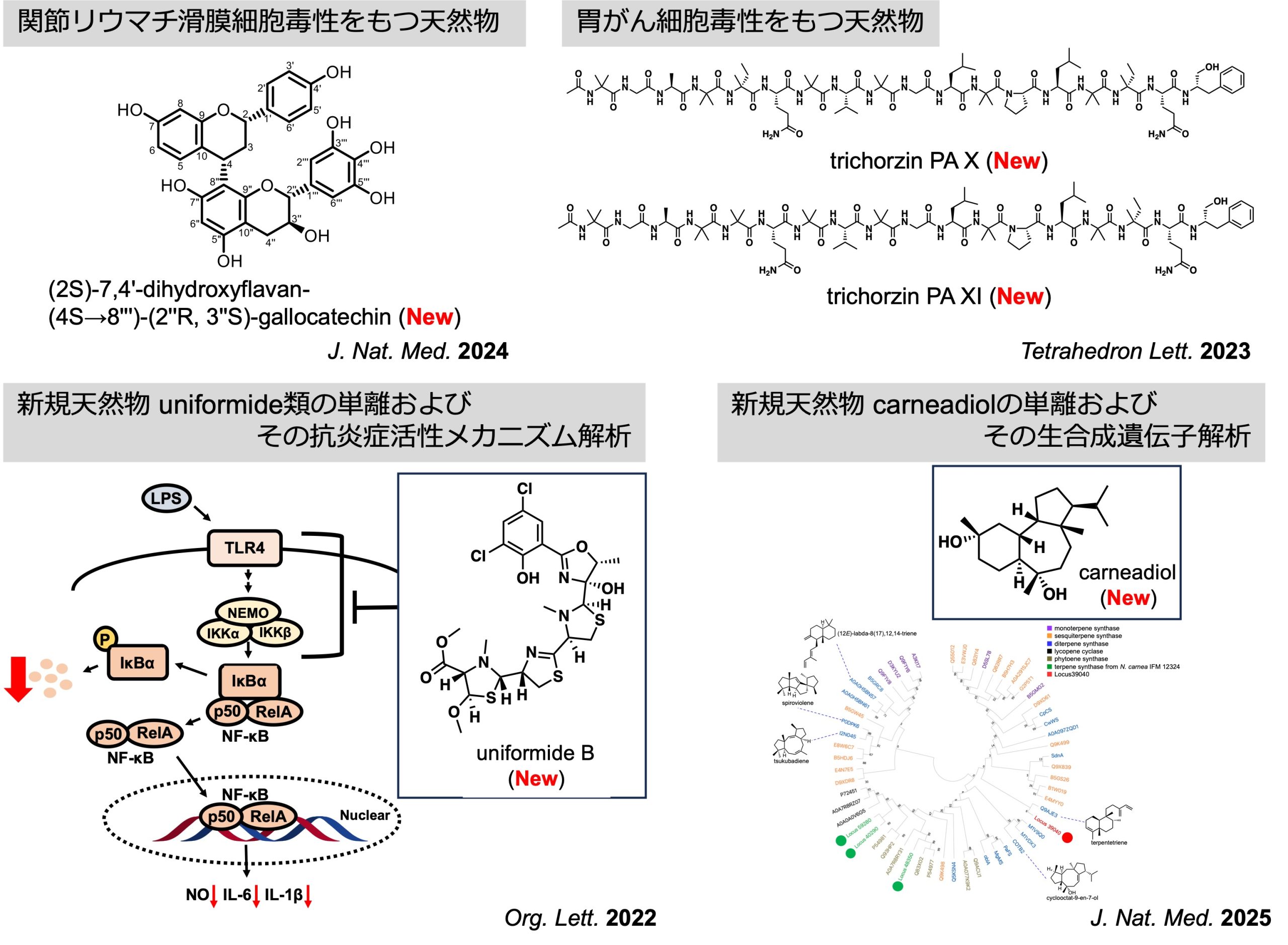1. および2. で構築した天然資源コレクションを,がんや関節リウマチなどの細胞内シグナル伝達経路や薬剤耐性感染症を標的とした多様な生物活性試験や,TLCやHPLCなどによる網羅的な化学分析法でスクリーニングしている.その後,選択した天然資源抽出物から,カラムクロマトグラフィーなどを用いて新規天然物や生物活性天然物を分離・精製し,NMRやMSスペクトルなどによりその化学構造の決定を行っている.単離した天然物については,その機能解明や生合成遺伝子の推定等を試みている.