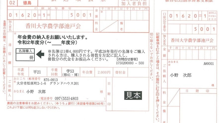(池戸会報に同封された郵便局専用振込用紙のサンプル画)