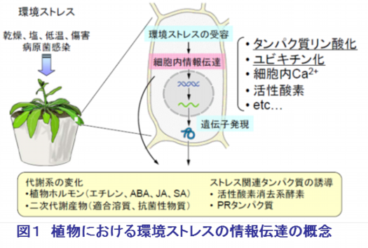 植物の生育に多大な影響を与える要因の一つが、病害も含めた環境ストレスです。環境ストレスとは、植物の生育環境が、至適範囲から外れ、阻害的な状態になることです。一方、植物は環境ストレスにただ曝されるだけでなく、それに適応・抵抗しようと、植物ホルモンを動員しつつ、遺伝子発現や代謝を、ストレスモードに切り替えます(図1)。その環境ストレス応答に関わる情報伝達の仕組みを、分子生物学的に明らかにし、環境ストレスに強い植物を作るための基礎研究を、当研究室では行っています。