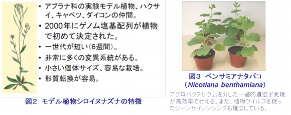 当研究室では、実験材料にモデル植物のシロイヌナズナ(図2)を、主に使って研究を行います。シロイヌナズナは図2にあるような、モデル植物として優れた特徴を有しています。また、植物でいち早くゲノム塩基配列が決定されたため、ゲノム情報を有効に活用できる、様々な研究ツール、リソースが充実しています。研究室メンバーは、これらを効率よく活用して、研究を進めるスキルを身につける事ができます。実験材料は、必要に応じてベンサミアナタバコ(図3)も使用します。