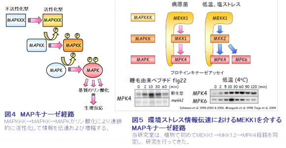 植物MAPキナーゼは、これら環境ストレスや感染刺激によって数分以内に活性化すること、また、変異体の表現型解析などから、情報伝達の初期過程で機能すると考えられています(図5)。当研究室は、環境ストレスに関与するMAPキナーゼ経路自体、およびその上下で機能する情報伝達機構を分子レベルで解明することで、環境応答システムの理解を目指しています。