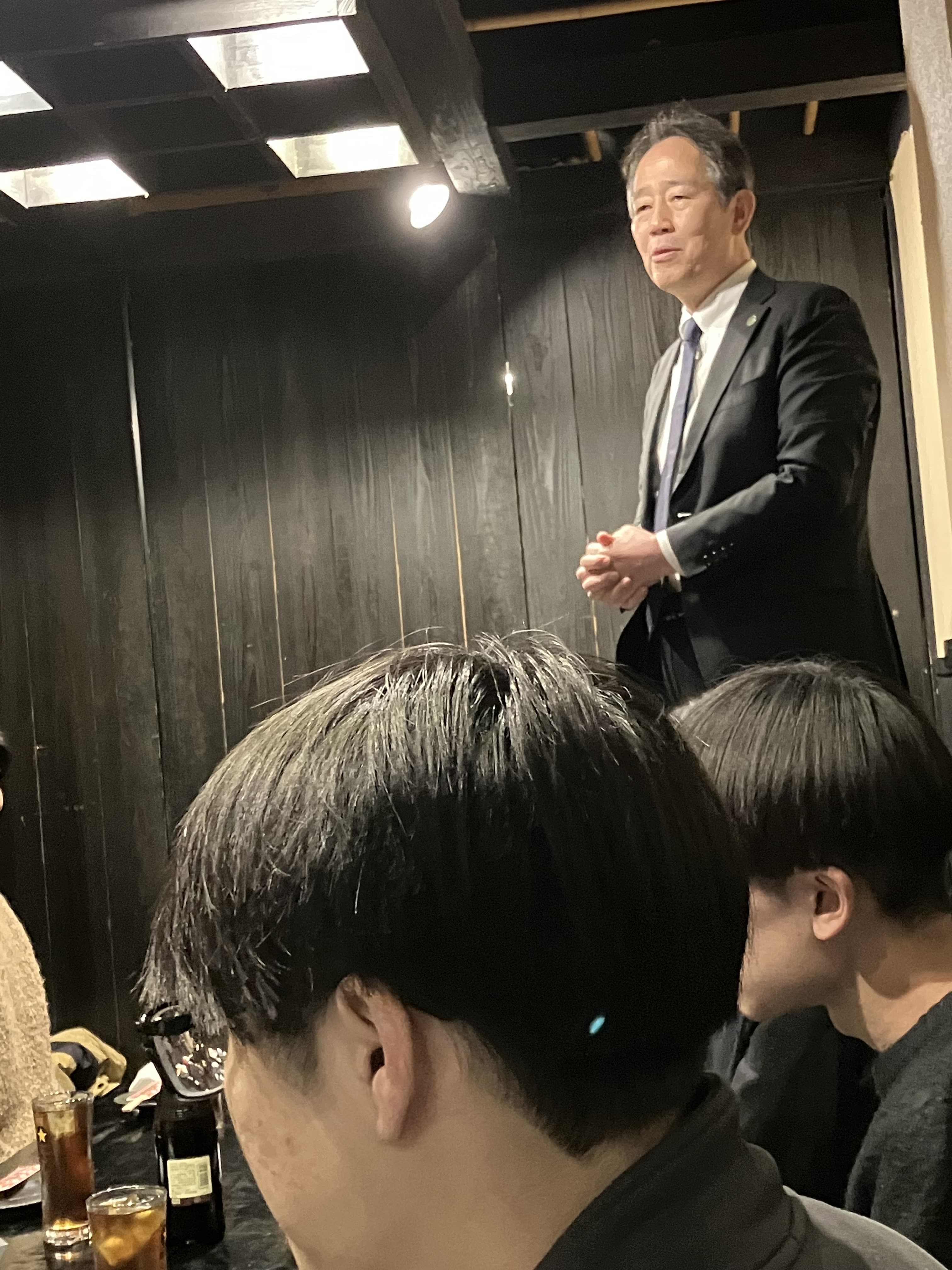 夕刻に高松市内にある居酒屋さんで3年生の新歓を行いました。研究担当理事をされている秋光先生にもお越し頂きました。3年生を含め全員が自己紹介した後、それぞれ歓談して過ごしました。お忙しいところ駆けつけてくださった秋光先生、コース実験を翌週に控えているにもかかわらずこの日の開催を承諾して頂いた望月先生に感謝いたします。