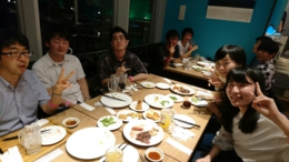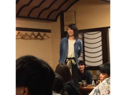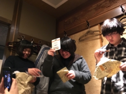 発表が終わった夕刻から高松市内のお店で追いコンが行われました。例年通りプレゼント贈呈があり、その後研究室に分かれて2次会を行いました。すでに就活で出かけているM1は2次会から参加する者もおりました。2次会のお店では一室市村研で貸し切り状態となり、周りの目がないせいか、みんなゆったりくつろいだり、ふざけあったりして過ごしていました。