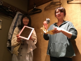 夕刻からは瓦町FLAG内の和食屋さんで忘年会となりました。例年ビンゴ大会のところ趣向を変えて研究室対抗ゲーム大会になりました。風船膨らませ競争、お絵かきお題当てゲームや目隠し触った物当てゲームなど、4年生の幹事さんたちがいろいろ企画を考えてくれました。望月研は人数が足りないので残りの研究室から出向しての混合チーム編成となったところ、ウチから出張った高木さんが得点を稼いで望月研の優勝に貢献しました。市村研は2位とまずまずでした。司会の豪くんもおもしろく進めてくれたおかげで皆さん楽しめたと思います。