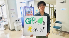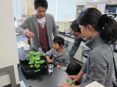 午後は次々訪れる来場者さんたちに、実験体験の簡単な説明してから、手を動かしてもらいました。恒例のアグロインフィルとレーションとDNA電気泳動アプライ体験、そしてGFPを発現させているベンサミアナタバコ葉の観察という3本立てです。今回はベンサミアナタバコの生育が復活し、バッチリGFPの蛍光を肉眼で観察できました。ラボメンバーにとっては、専門的な事柄をわかりやすく高校生に説明する良い練習になりました。
