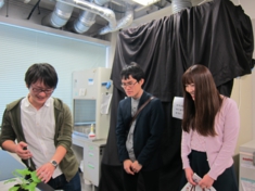 11月3日(土)は農学部収穫祭が行われました。市村研は定番のGFPで光る葉っぱの模擬実験とGFPの観察でした。今年は気合いをいれて準備を進め、きっちりGFPが光るように植物を準備できました。市村研は午前と午後にシフトを分けて来場者対応と模擬実験の補助を行いました。3年生は先輩の指導の下、GFPを発現する植物の準備を主に担当してもらいました。市村は午前中は高校生対象の相談員業務があり、午後から研究室に戻りました。午後にはレジェンドとなっている某卒業生さんが素敵なゲストと一緒に研究室にお越しになり、市村は長い時間お相手していたので、実験室にあまり顔を出せませんでしたが、院生は慣れているので任せても全く不安がありません。それから、東くんと秋光研を修了した辻くんと松岡くんも顔を見せてくれました。今年は図らずもビックサプライズが有り、ゲストと面識のある在学生は動揺してざわついて例年にない面白い収穫祭となりました(笑)。