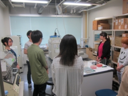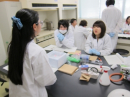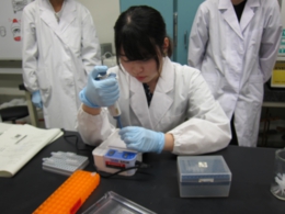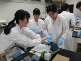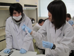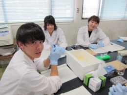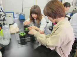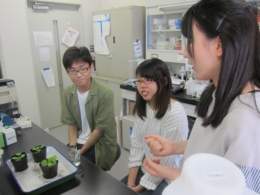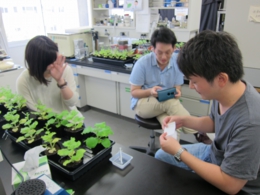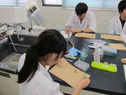 例年は応用生命コース実験とぶつかって実施できておりませんでしたが、今年度は2年生研究室体験に参加することができました。12人の応用生命コース志望の学生さんがやってきました。まずは、市村研の研究内容の紹介や今後のコース分属や研究分属のアドバイスを30分ほど話した後、実験体験を行いました。メニューはベンサミアナタバコのインフィルとレーションとアガロースゲル電気泳動です。市村研学生が実施内容の説明を行い、操作のお手本を見せた後、2年生が交代しながら模擬実験に取り組んでもらいました。一通りメニューをこなした後は、講義した部屋にもどり、レポートを書いてもらいました。皆さん、それなりにやりがいがあったようで、電気泳動ではサンプルをアガロースのウェルに入れる操作が最初難しかったけど、慣れるとできるようになったなどの感想がありました。今回参加者に女子が多かったせいか、市村研の女の子たちが張り切ってサポートしてくれました。男子学生も併せて、準備や片付けをお疲れ様でした。