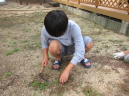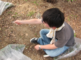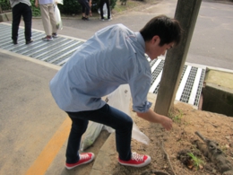 農学部からバスで向かい、農場に着いたらまず田植えです。田んぼに渡した糸に等間隔で赤いひもが目印として取り付けてあり、目印の下にイネの苗を植えていきます。諸隈先生のかけ声の下、学生さんが一斉に苗を植えながら作業を進めてゆきました。1時間ほどの作業で予定の田んぼの半分まで田植えを終えて作業は終了です。残りは後半担当の2班が田植えをします。小雨の降る中、それなりに楽しんで田植えをしているように見えました。