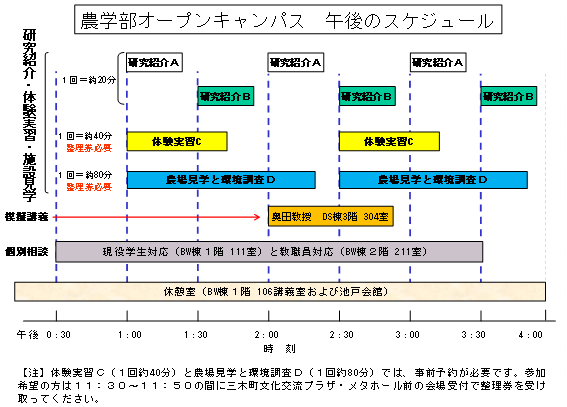①体験実習C(1:00~1:40)→模擬講義(2:00~2:45)→研究紹介A(3:00~3:20)→研究紹介B(3:30~3:50)