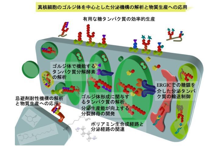 分裂酵母のゴルジ体は明確な層板構造を有する細胞内小器官(緑色)です。ゴルジ体の初期層板では、粗面小胞体(黄緑色)から輸送されてくる分泌タンパク質の受け取りや、粗面小胞体で働くタンパク質の逆行輸送していますが、この過程に関与するタンパク質の解析を行っています。また、ゴルジ体の内腔で働く、糖鎖修飾に関わるタンパク質の解析や、膜貫通領域を切断するタンパク質分解酵素の解析なども行っています。さらに、ゴルジ体の表層に存在するタンパク質の解析も行っており、層板構造の維持や輸送過程に必要な新規なタンパク質の同定も試みています。この他にも、動物細胞で機能が不明な関連遺伝子を分裂酵母を用いて解析を試みており、ゴルジ体の機能や物質生産に関する重要な知見が得られています。